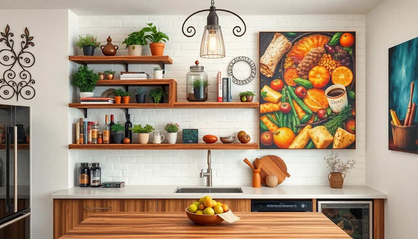 Functionality also matters. Chalkboards offer a practical purpose, serving as message centers or grocery lists, and they add a rustic charm. Wall-mounted spice racks maintain organization and enhance decor with their unique design. Open shelving not only displays decorative items but also showcases culinary tools, merging style and function.